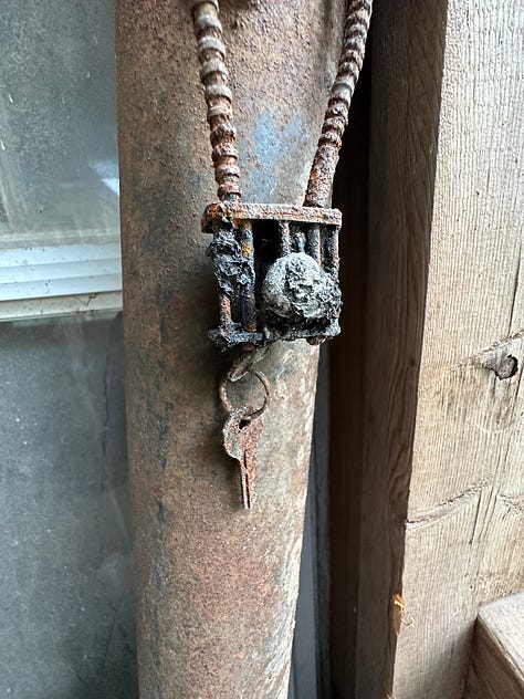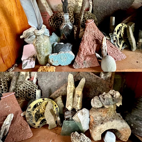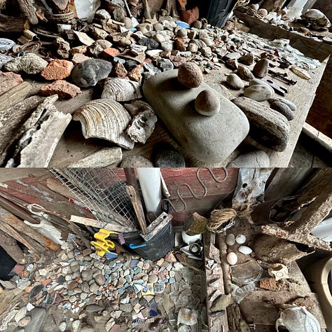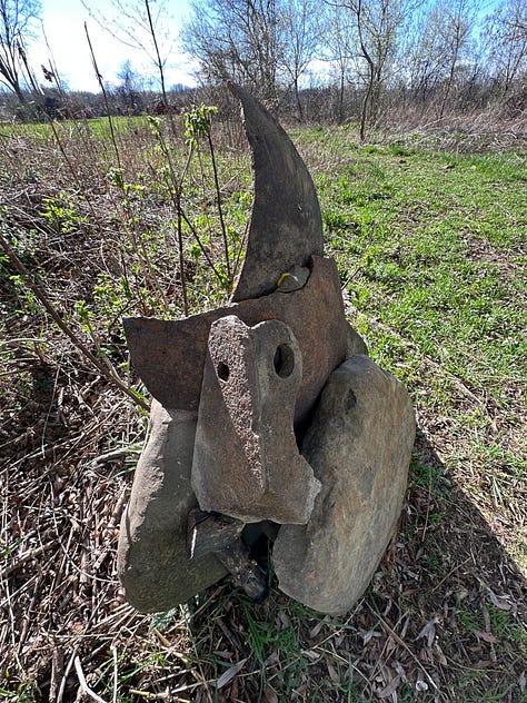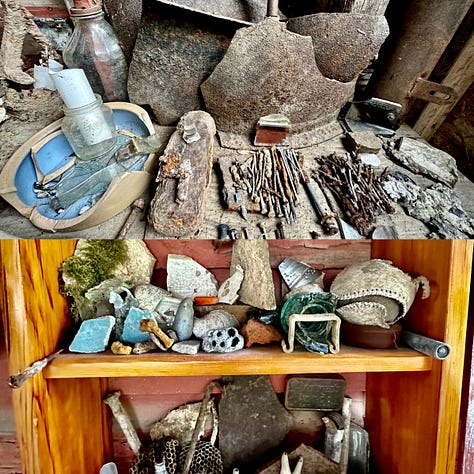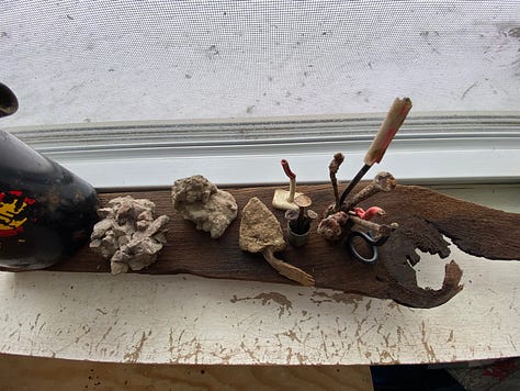 The wet spring (and pre-spring mud season) turned into a wet hot summer like the movie, and it’s bringing weird shit up in the yard’s slow-motion churn. The house was built four years after the Revolutionary War, so there are centuries of lord knows what just under the surface. I can’t stick a shovel in the ground without turning up an old nail or piece of pottery. My collections are starting to take over every available flat surface. I’m 100% sure there are bodies down there. I even thought I saw a human face in the dirt, but what I’d actually done was find my glasses. I’ve been looking for them for almost a year.