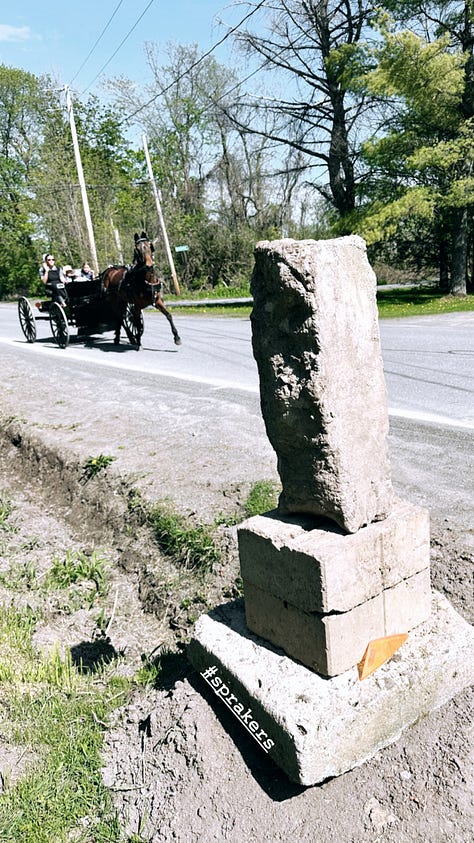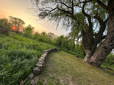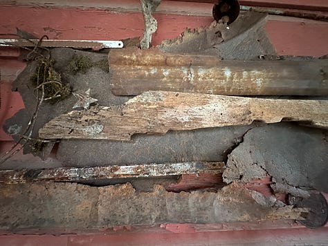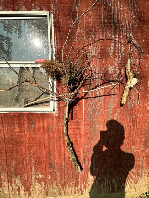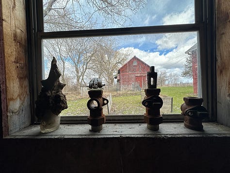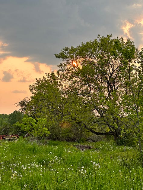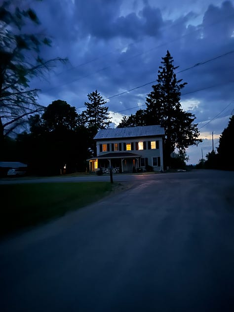 Meanwhile, Jeff Goldblum was right: black flies and mosquitos are biting, and the box elder bugs have evolved to be the color of our barn. Besides us and Rosie, there are woodchucks, coyotes, rabbits, robins, voles, mice, blue jays, sparrows, chick-a-dees, cardinals, swallows, turtles, toads, hawks, chipmunks, buzzards, a pileated woodpecker, two snake families, frogs, squirrels, deer, fox, my neighbor Dave and his grandson, and even, Dave swears, a bobcat. Dave misses his wife terribly. He built a replica of a 1950s-era diner booth behind his woodpile but didn’t finish it in time for her to sit there with him. We have his number on an envelope on the fridge in case of emergencies, and he has ours. Similarly, the woodpeckers have learned to communicate by pecking our metal roofs. His bobcat news made me feel less crazy too. I swore I saw a larger-than-should-have-been cat from our bedroom window the day we moved in, and we occasionally hear louder-than-should-be yowls at night. There are no bears in the immediate vicinity, but there are plenty in the county. I can see the Adirondacks when the green is gone; I think mega-fauna migrate south to eat garbage in the summer.